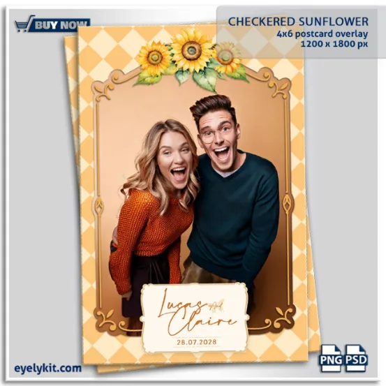 A Rustic Yet Elegant Design. Sunflowers are a timeless symbol of happiness, warmth, and positivity, making them the perfect element to highlight in a photo booth overlay. Combined with the earth-tone yellow checkered background, this design delivers a rustic yet sophisticated vibe that works beautifully for indoor and outdoor celebrations alike.