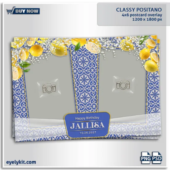 Bring timeless Italian charm and coastal elegance to your photo booth events with our Classy Positano Photo Booth Overlay. Inspired by the breathtaking Amalfi Coast and the picturesque town of Positano, this overlay combines vibrant lemons, delicate white florals, and Mediterranean blue tile patterns to create a stunning, sophisticated backdrop for photos. Perfect for birthdays, weddings, summer parties, and destination-themed celebrations, this overlay elevates any event with its classy yet cheerful aesthetic.