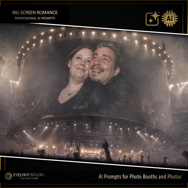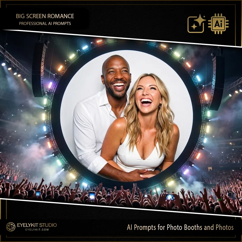 This Concert Kiss Cam AI Prompt is a “brilliant and stunning” digital asset engineered for photo booth owners who want to offer a high-energy, stadium-scale transformation. Utilizing advanced generative AI, this prompt takes standard event captures and projects them onto a massive, glowing digital display in the middle of a sold-out arena, creating an unforgettable “Main Character” souvenir.