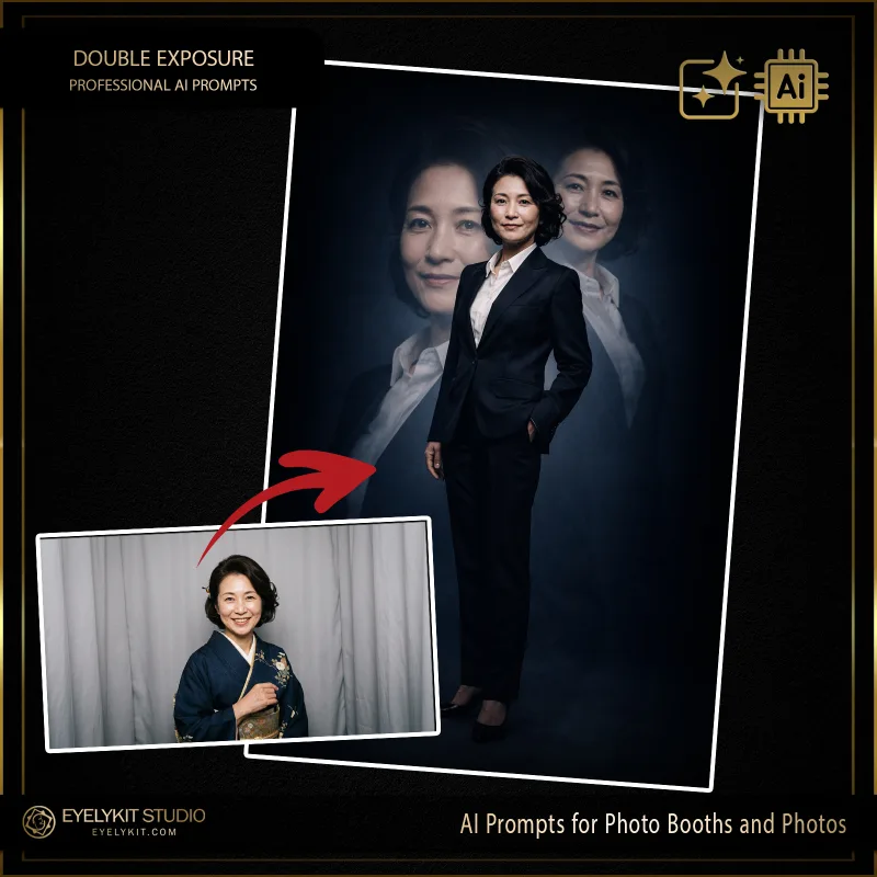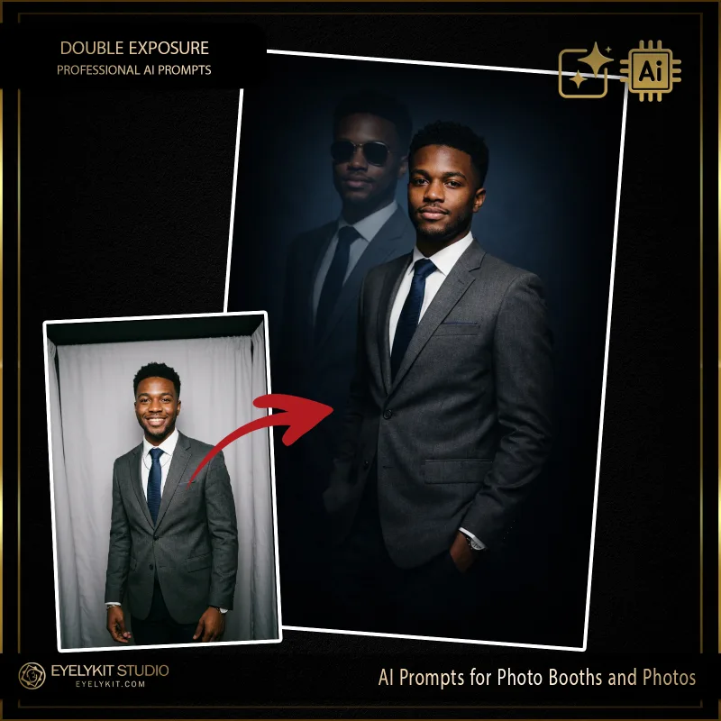 The Double Exposure AI Prompts pack is designed to transform standard photo booth captures into high-end works of contemporary art. By utilizing advanced image-to-image AI techniques, these prompts allow guests to see themselves through a surreal, multi-layered lens—a style previously only achievable by professional editors with hours of post-production time.