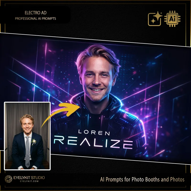 Our Electro Ad photo booth prompt is built to interact with the specific diffusion models used by the leading platforms in the event industry. We ensure that the core identity of the guest remains 100% recognizable while the futuristic branding is applied with cinematic realism