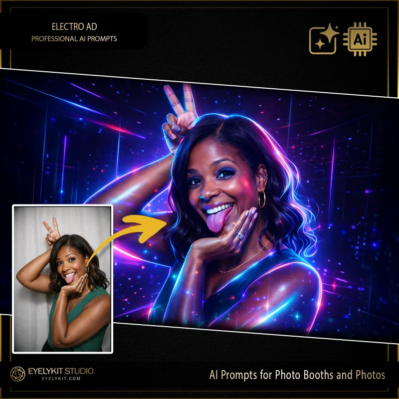Our Electro Ad photo booth prompt are not basic instructions; they are professionally weighted technical assets designed to interact with the diffusion models used by leading photo booth platforms. We ensure your booth delivers consistent, high-fidelity results across all hardware configurations
