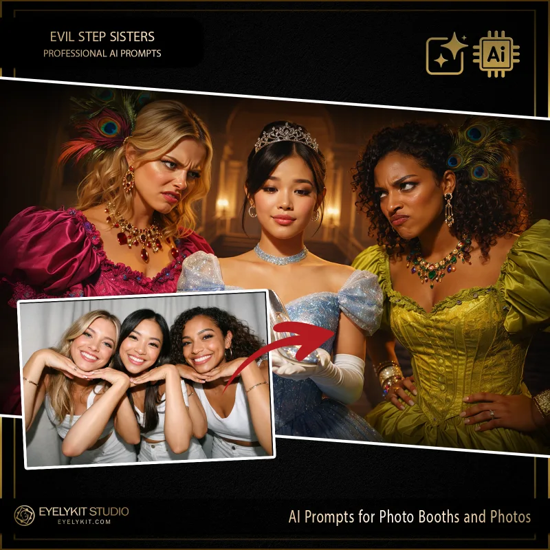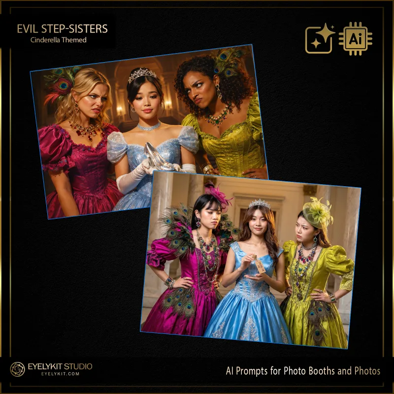 Embrace your inner villain with the Evil Step Sisters AI Prompt Pack. This specialized collection is the ultimate digital asset for photo booth owners who want to offer a “brilliant and stunning” character transformation experience. Inspired by the iconic trio of Cinderella and her two infamous stepsisters, these Evil Step Sisters ai prompts use advanced generative AI to turn your guests into a high-fashion, dark fairytale ensemble.