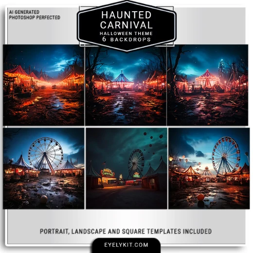 Perfect for Halloween parties, themed events, haunted houses, festivals, and photo booths of all kinds, the Haunted Carnival set is designed to wow guests and elevate your business offerings during the spooky season. Each backdrop in this collection is AI-generated and Photoshop-perfected to ensure sharp detail, balanced lighting, and rich colors. No pixelation, no cheap effects—just professional-quality visuals that integrate seamlessly into your workflow.