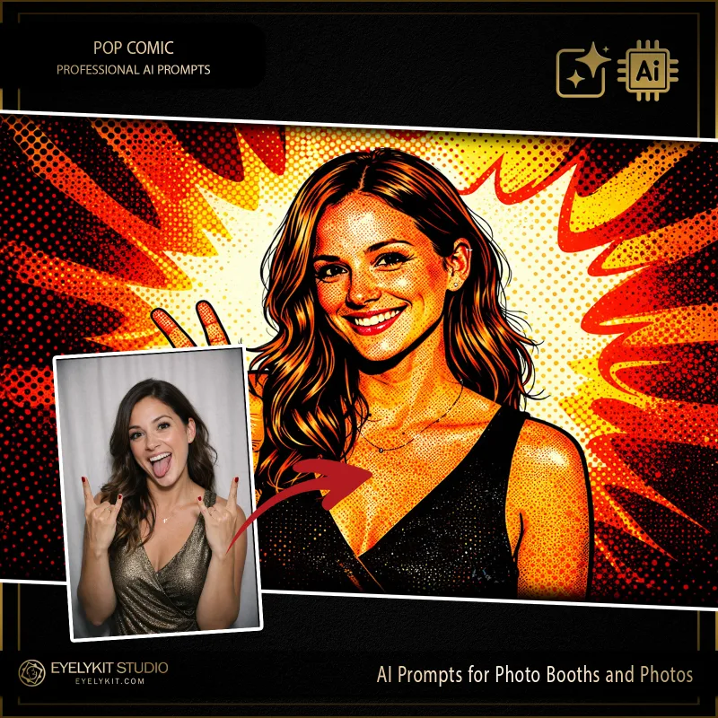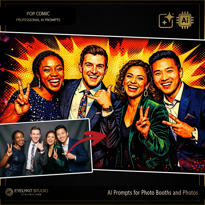 Utilizing advanced generative AI, these Pop Art Comic ai prompts take standard event captures and meticulously replicate the iconic look of vintage comic books and classic pop art. Whether you are booking a superhero-themed birthday, a retro corporate activation, or a vibrant comic convention, these comic ai prompts deliver an unparalleled level of dynamic color, retro texturing, and stylized flair that physical props simply cannot replicate.