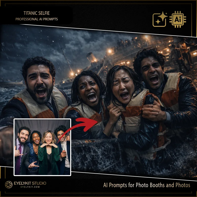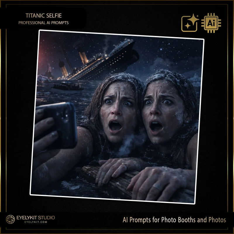 This collection is a “brilliant and stunning” digital asset for photo booth owners looking to capitalize on the viral trend of historical cinematic transformations. Engineered to create a hyper-realistic “disaster selfie” aesthetic, these titanic ai prompts for photos use advanced generative AI to place your guests in the middle of the Atlantic, featuring the iconic ship, icy waters, and a cinematic night-sky atmosphere.