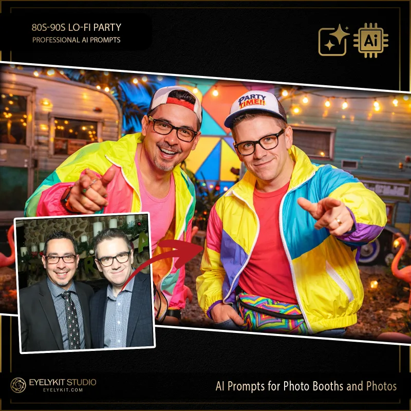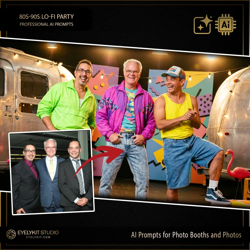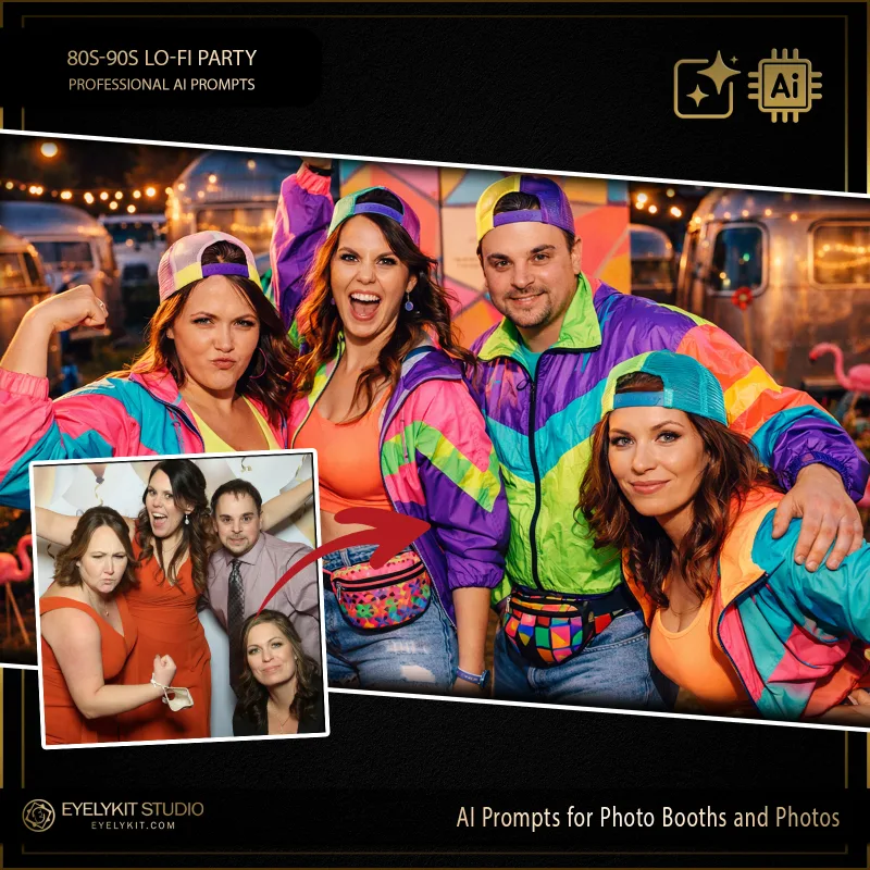 The result generated by this prompt is visually explosive and guaranteed to get a laugh. As one of the most entertaining ai prompts for image generation available, the AI flawlessly strips away the formal or modern clothing of a standard photo booth capture. Guests are instantly outfitted in the absolute height of questionable retro fashion. Subjects are restyled in eye-popping neon windbreakers, acid-wash jeans, oversized graphic tees, chunky gold hip-hop chains, colorful fanny packs, and classic trucker hats.